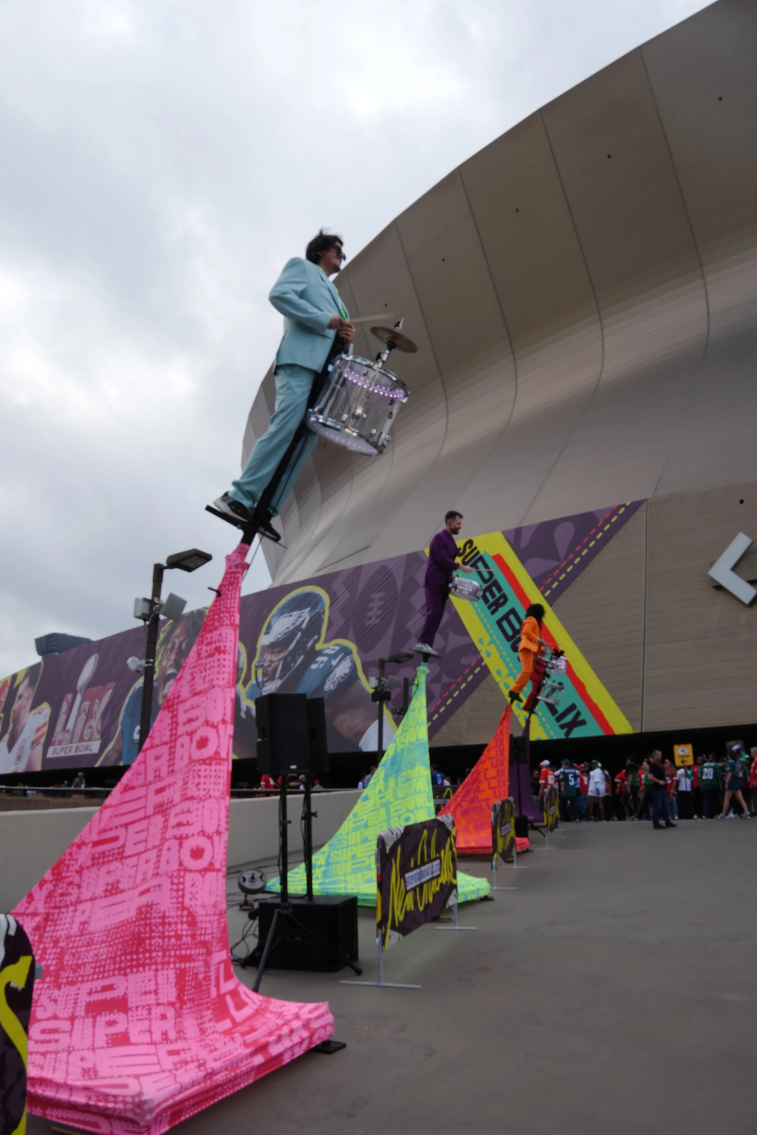 Adding musical acts can help any event stand out. Like the towering drummers at Super Bowl LIX